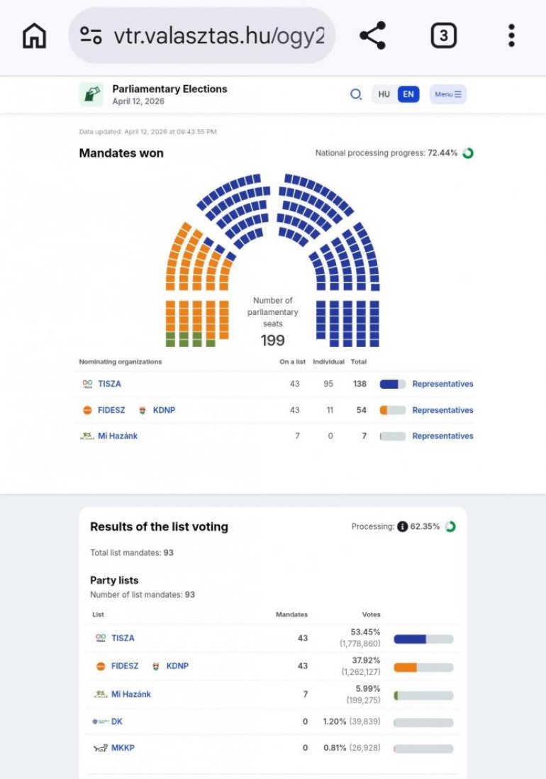 На основу 72,44% одсто пребројаних гласова опозициона странка Тиса освојила је 138 мандата (43 са листа, 95 појединачно), док је владајући Фидес добио 54 мандата (43 са листа, 11 појединачно) у мађарском парламенту, наведено је на сајту Националне изборне комисије Мађарске.