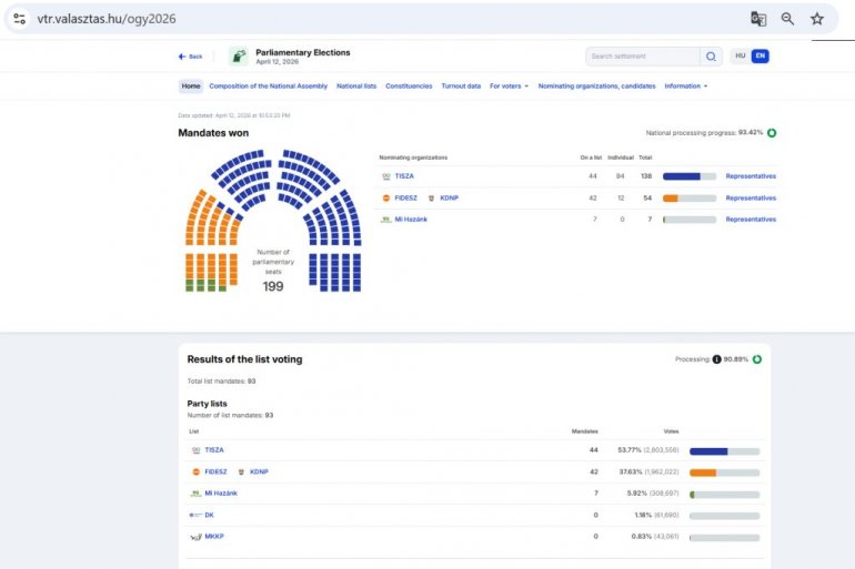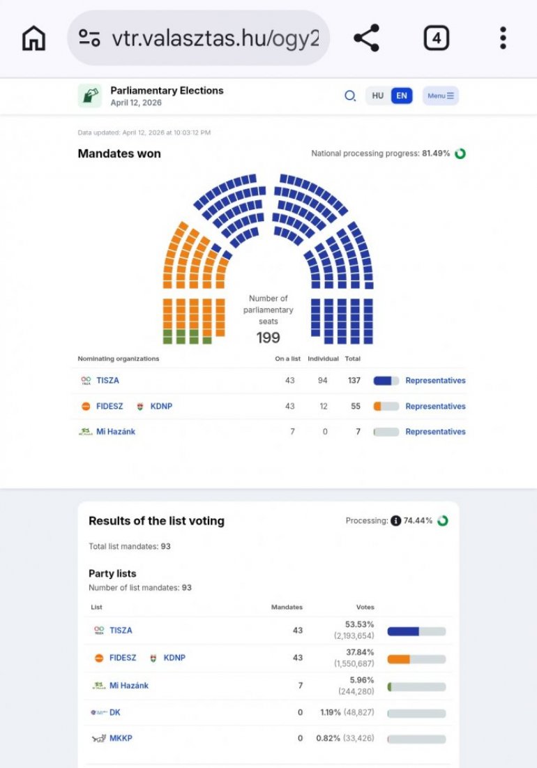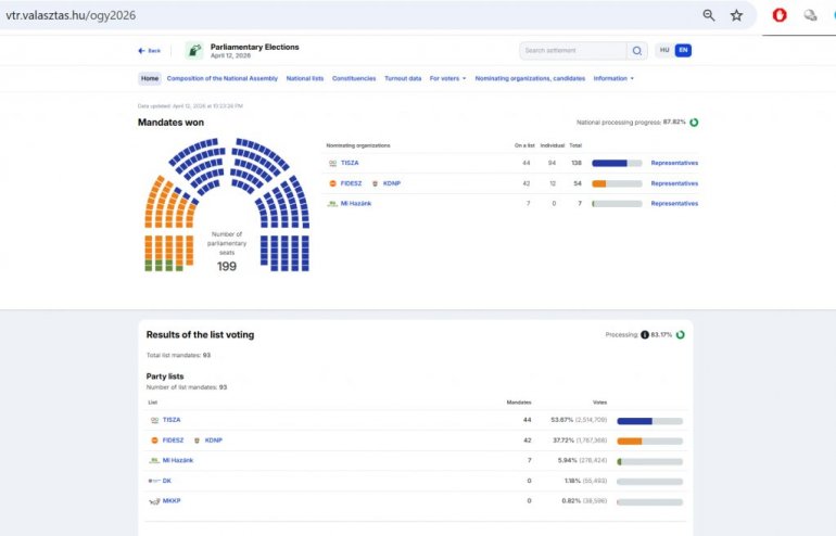 На сајту Националне изборне канцеларије ажурирани су подаци, на основу којих Тиса води на националној листи са 21,54 одсто гласова, Фидес је други, док је Ми Хазанк на трећем месту, али је и даље у конкуренцији. Према делимичним резултатима, Тиса има 49,43 одсто, Фидес 41,99 одсто, а Ми Хазанк 6,10 одсто. Демократска коалиција знатно заостаје, са 1,15 одсто.