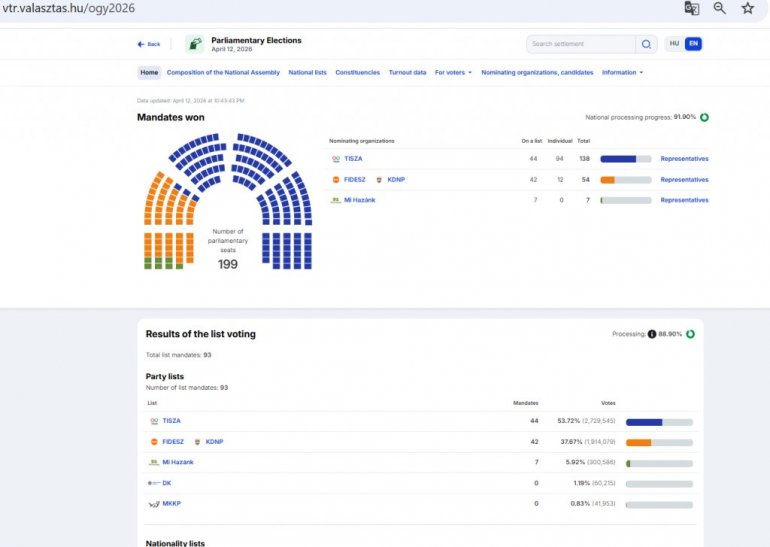 На основу 87,82% одсто пребројаних гласова опозициона странка Тиса освојила је 138 мандата (44 са листа, 94 појединачно), док је владајући Фидес добио 54 мандата (42 са листа, 12 појединачно) у мађарском парламенту, наведено је на сајту Националне изборне комисије Мађарске.
