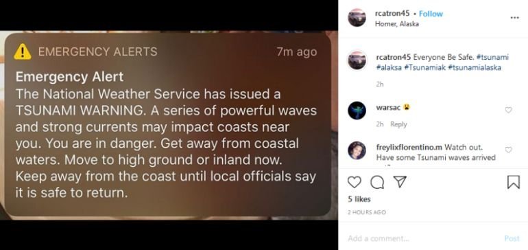 Национална служба за контролу Океана и атмосферских промена је након земљотреса издала упозорење на цунами које је на снази за југ Аљаске и Пацифичко приобаље од Кенедијевих врата код острва Кодијак, до мореуза Унимак између полуострва Аљаска и острва Унимак.