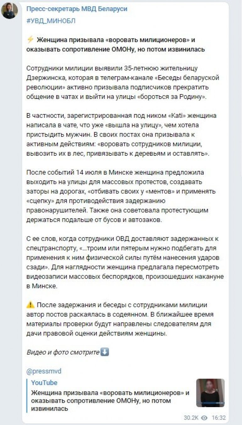 МИНИСТАРСТВО унутрашњих послова Белорусије објавило је снимак и преписку наводних организатора протеста у Белорусији у којима они позивају на отмицу припадника снага безбедности и њихово малтретирање.