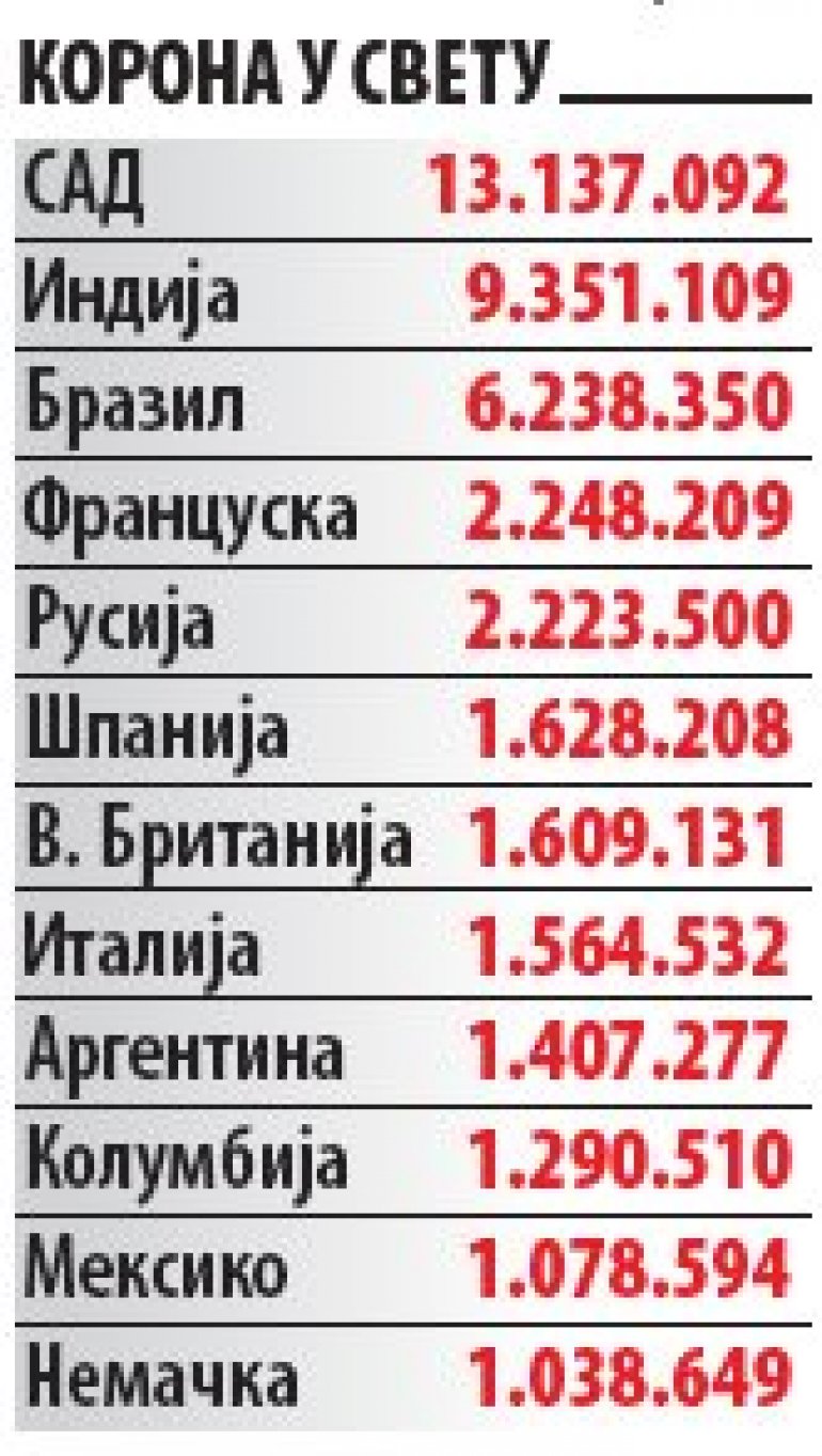 Највише инфицираних пријављују САД (13,6 милиона), Индија (9,3) и Бразил (6,3 милиона), у коме је за последња 24 сата регистровано невероватних 52.000 новозаражених. Ове три државе у врху у црне листе и кад је број умрлих у питању. У Русији су јуче забележена 26.683 нова случаја, па се број оболелих попео на 2,2 милиона. Осим Русије, у Европи највише заражених у једном дану имају Немачка са више од 14.000 и Француска са више од 12.000 особа.