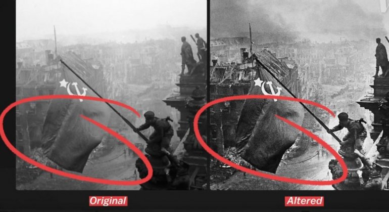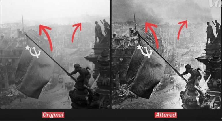 Међутим, убрзо се испоставило да ће историјска фотографија постати и један од најранијих примера фотомонтаже када је реч о ширењу пропаганде. То се може видети по војнику Абдулхакиму Исмаилову (придржава носиоца заставе) који је на слици имао два ручна сата, што је многима био доказ пљачке коју су починили војници Црвене Армије. Други су тврдили да је у питању Адријанов компас и да је Халдеј, да би избегао контроверзе, манипулисао фотографијом и уклонио тај детаљ.