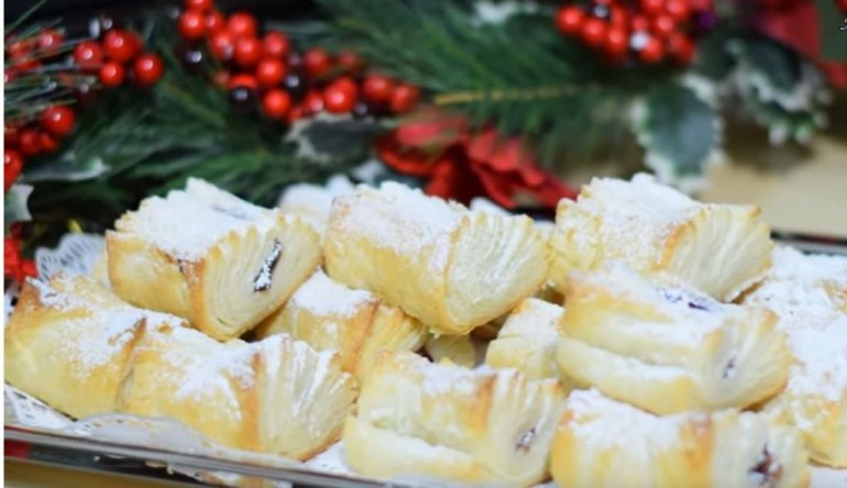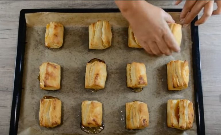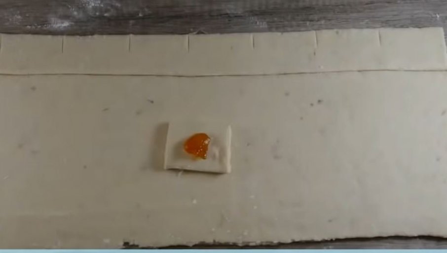 Поступак поновити још два пута, четврти пут расклагијати тесто на дебљину 1цм, опкројити ножем са свих страна да би се лепо разлистало, исећи на квадрате и на сваки ставити кашичицу џема.