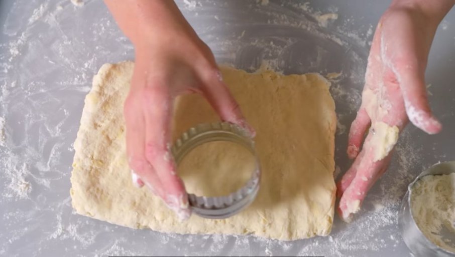 За погачице би требало да хладан путер исеците на коцкице или танке кришке, па га у процесору посипајте по брашну. Миксирајте 5 до 7 пута или док се путер не претвори у ситне комадиће. Убаците мешавину путера и брашна у велику чинију. Направите рупу у средини, а затим сипајте млеко (или млаћеницу). Мешајте док се не формира чупаво тесто.