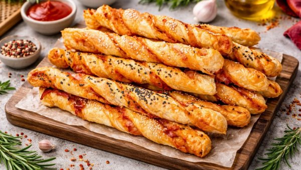 Размотајте једно лиснато тесто и ставите га на папир за печење. Равномерно га премажите парадајз пиреом. Поређајте сланину преко целе површине. Поспите ренданим чедар сиром. Прекријте другим лиснатим тестом и благо притисните ивице виљушком да се споје. Исеците тесто на тракице (око 10–12 комада). Сваку тракицу увијте у спиралу. Поређајте штапиће на плех, премажите умућеним јајетом и поспите сусамом. Пеците у претходно загрејаној рерни на 200°C око 20 минута, док не постану златно-хрскави.