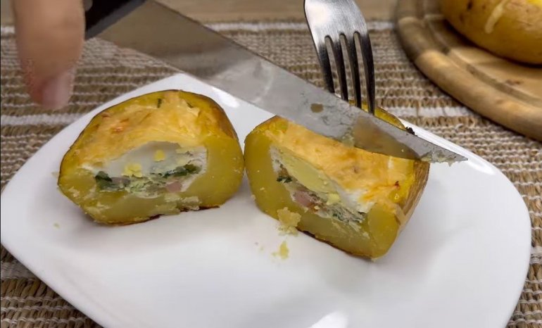 Све што треба да урадите јесте да испечете кромпир, напуните смесом, поспете сиром и запечете. Једино што дуже траје је печење, али се лако прави и савршеног је укуса. Уживаје у залогајима кромпира пуњеног шунком и јајима!