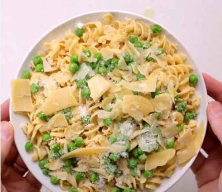 Оцедите тестенину и прелијте топлим умаком од грашка, додајте грашак који нисте уситнили у блендеру.