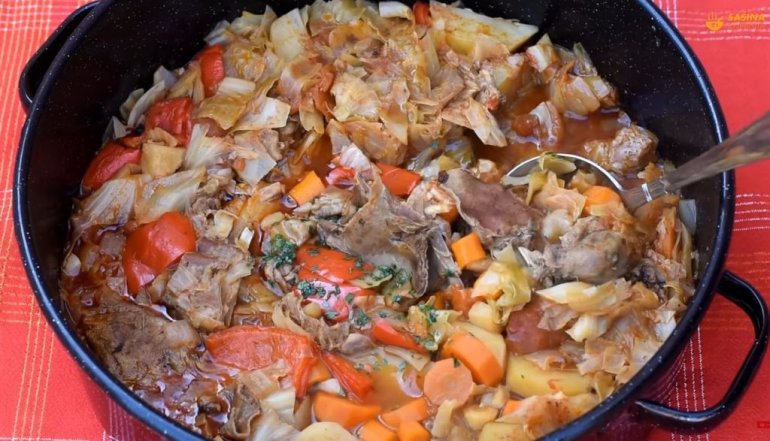 Продинстајте лук, шаргарепу, пашканат, парадајз и сланину. Додајте месо и зачине. Затим посложите кромпир и купус, и налијте водом. Кувајте добра два сата док се све лепо не раскува.
