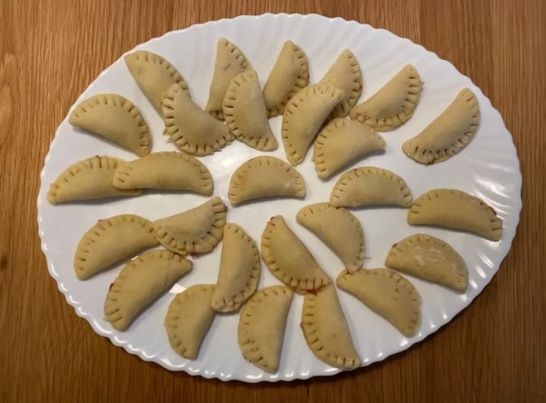Разваљајте тесто на дебљину од 2-3 мм, према потреби посипајући с мало брашна да се ваљак не лепи. Оставите мало да се просуши па га сеците на траке дебеле око два центиметра. Сеците на квадратиће и у сваки ставите мало надева па их преклопите у троугао, затворите и стисните ивице виљушком да се учврсте.