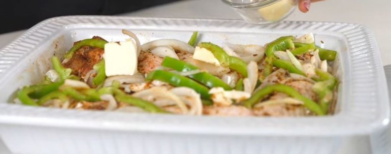 Преко ставите сецкану паприку и црни лук, па поређајте путер. Пеците у загрејаној рерни на 190°Ц сат времена поклопљено, а онда скините поклопац и пеците још пола сата.