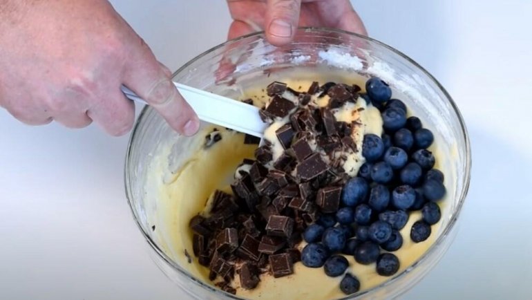 У посебној посуди помешати глатко брашно, прашак за пециво и со. Суве састојке сада постпено додавати мокрим истовремено мешајући како би се добила компактна и уједначена смеса. Одмах у добијену смесу додати тамну чоколаду претходно нарендану на мале комадиће и свеже боровнице. Смесу распоредити у калупе.