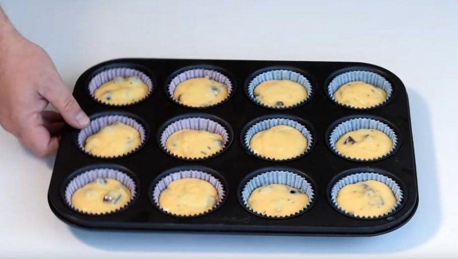 Слободно ставите и по две модлице за мафине јер се касније лакше ваде из модлица и мање се лепе. Мафини са боровницама и чоколадом се пеку 20 минута на 180 Ц. Без коришћења вентилатора.