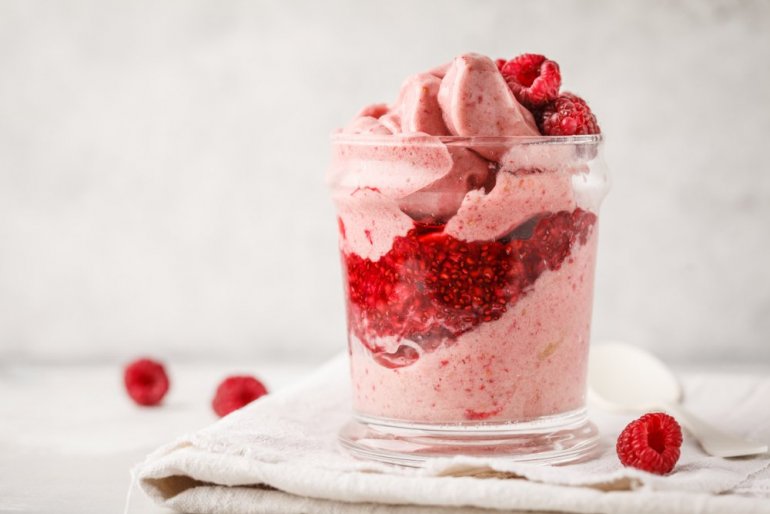 Слатка павлака се умути па се у њу дода растопљена црна чоколада и 100 г свежих малина као и један грчки јогурт. Пошто не волимо много сладак сладолед, не додајемо шећер, али ко воли може да дода шећер у праху. Заледите и уживајте!