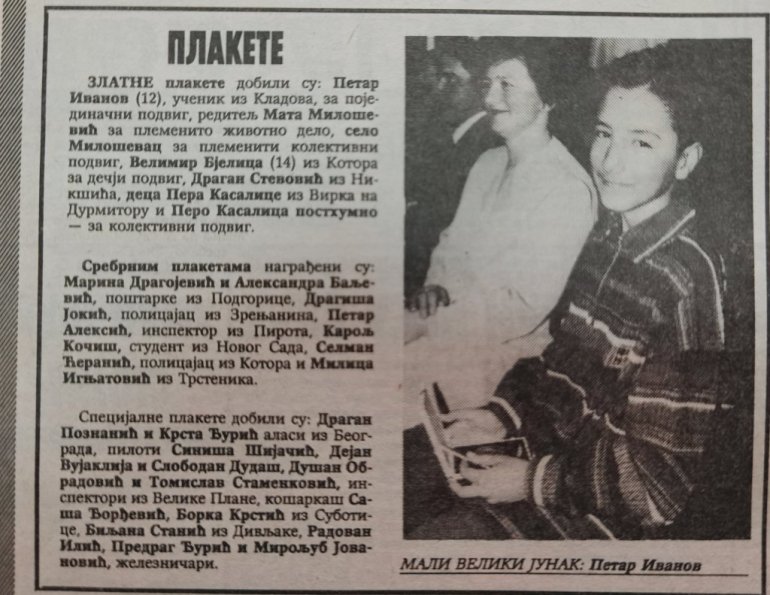 Овако започињемо причу са златним Петром Ивановим, из Кладова, најплеменитијем дететом 1996. који је, у лето те године, спасао двојицу основаца, готово његових вршњака из Дунава. Дивовско срце тринаестогодишњег Петра и дивовска снага Дунава ушли су у борбу за два живота. Петар је уписан као победник. А, Дунав је био равнодушан. Ко зна колико ће се пута још ова водена грдосија рвати са спасиоцима, попут овог малог-великог јунака јуначког срца.