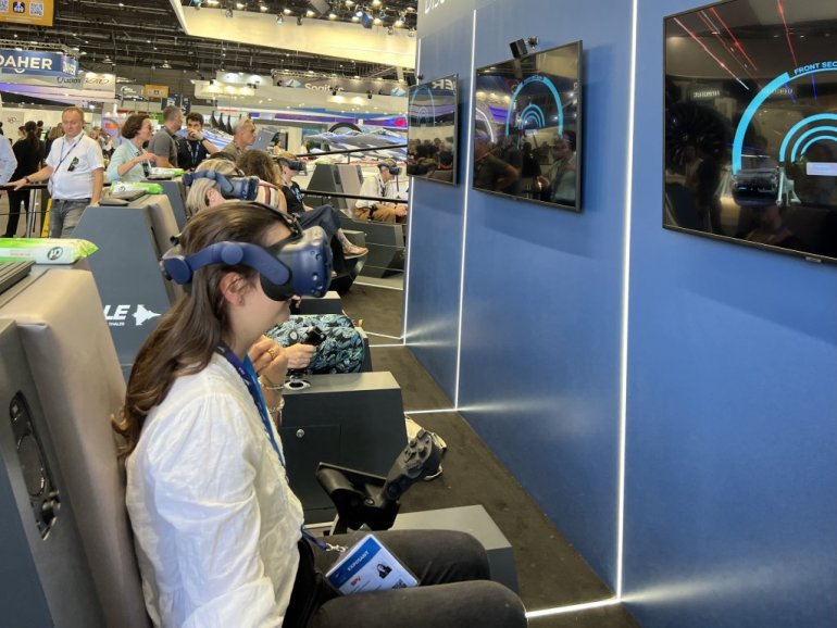 "Дасо" је понудио и занимљиву симулацију летења на "рафалима" са 3Д визиром. Пробали смо, без вртотлавице, да "полетимо", урадимо лупинг над морем, а затим и слетимо на носач авиона. Није једноставно, али утисак је спектакуларан.