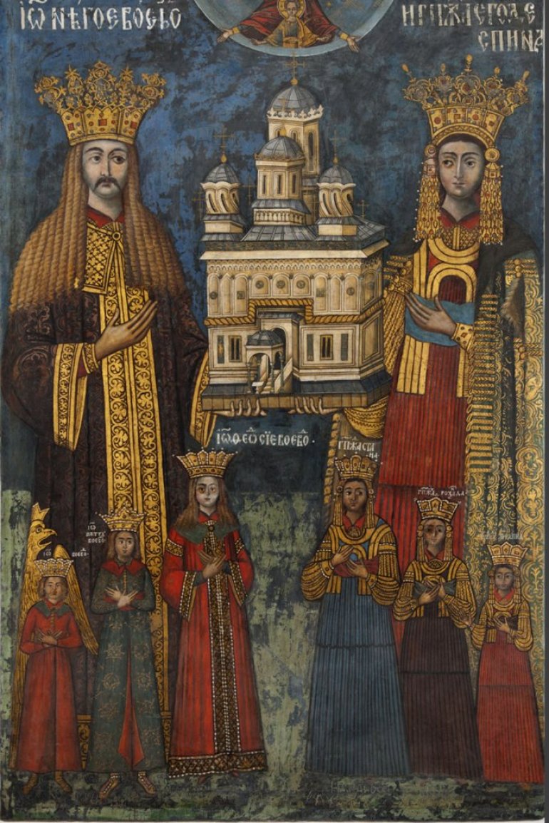 Распоред светих слика и вечних коначишта у владарској гробној цркви није случајност, већ кодирана прича о неуништивости светиња и великих идеја, намењена онима који умеју да је прочитају. Зато и данас лево од улаза у високи храм блешти ктиторска фреску војводе и првог кнеза Влашке Неагоја Басараба и његове жене Деспине (деспотице) Милице Бранковић, кћери деспота Јована, последњег владара српске државе у егзилу, са престоницом у сремском Купинику, данашњем Купинову. Десно од улаза на злату су насликани ликови кнеза Лазара и кнегиње Милице. Карол Први, кнез, а после Великог рата први краљ независне Румуније, одредио је да храм у Куртеа де Арђешу буде гробна црква румунских краљева, а да њихове вечне куће буду управо испод светих слика старих ктитора.