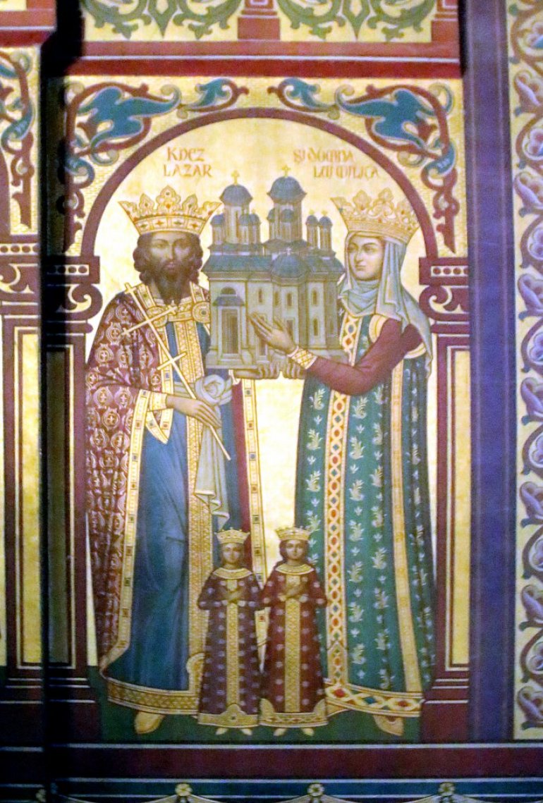 Карол, владар из старе немачке витешке лозе Хоенцолерн-Силмаринген захтевао је да почива испод ликова Хребељановића и Бранковића јер они стоје на почетку саге која је довела до стварања румунске цркве, али и нације. Кнез Лазар и кнегиња Милица су је започели у 14. веку шаљући Лазаревог рођака Никодима, ученог монаха-дипломату из Хиландара, да као "подунавски Свети Сава" на територијама младих војводстава Влашке и Молдавије шири писменост, културу и православље.