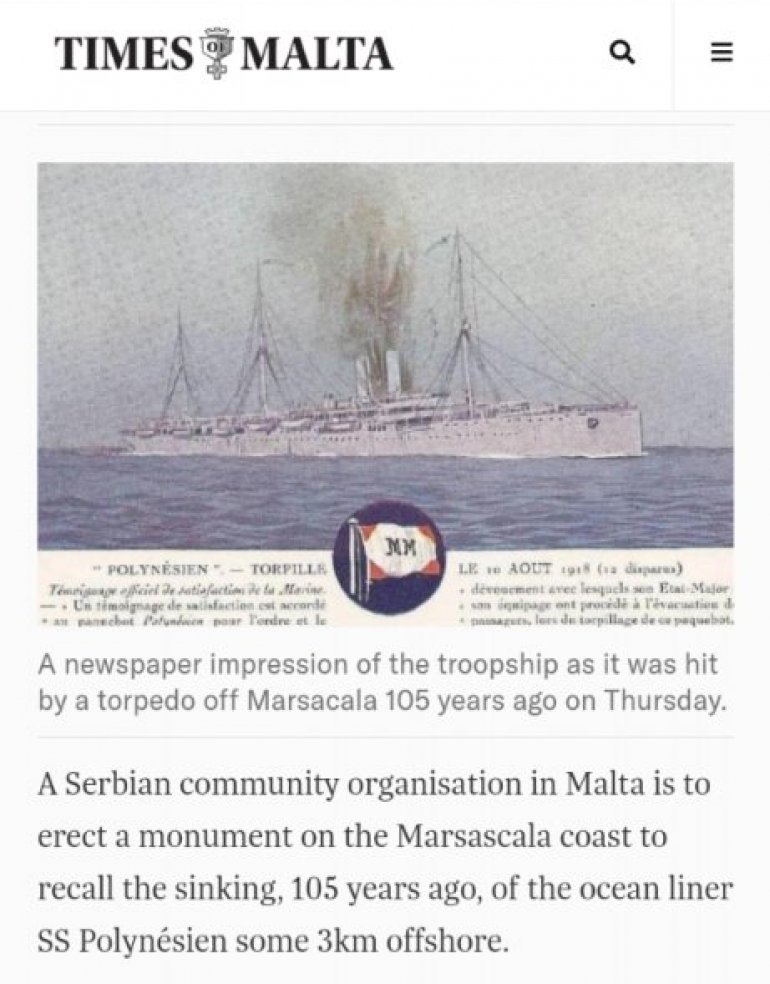 Водећи малтешки дневник "Тајмс оф Малта" објавио је пре неколико дана да ће у Марсаскали бити подигнут споменик сећања и захвалности за спасавање српских бродоломника на иницијативу Српског просветног и културног центра "Света Јелена Анжујска" са Малте, а у сарадњи са овдашњом водећом културном институцијом Баштина Малте и локалним саветом Марсаскале.