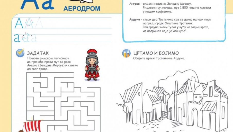 Истовремено, ђаци уче и ћирилицу, а поред разноврсних појмова, предмета и историјских личности, чија имена почињу назначеним словом, у понуди су им и друге мале језичке и логичке игре, попут лавиринта. И кроз тај лавиринт, на пример, ђаци треба да се сналазе у улози неког локалног јунака. Ту су и илустроване игре повезивања назива са сликама, такође, нудећи најмлађима знање из локалне и националне традиције.