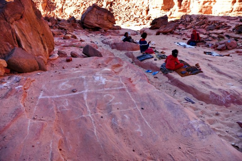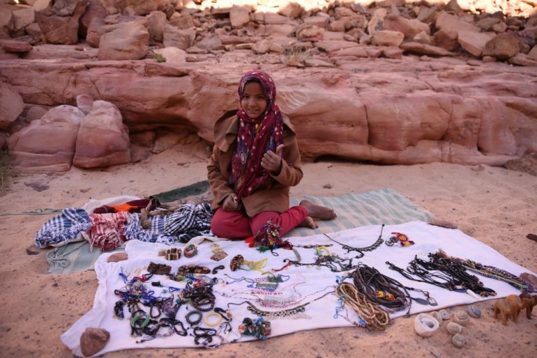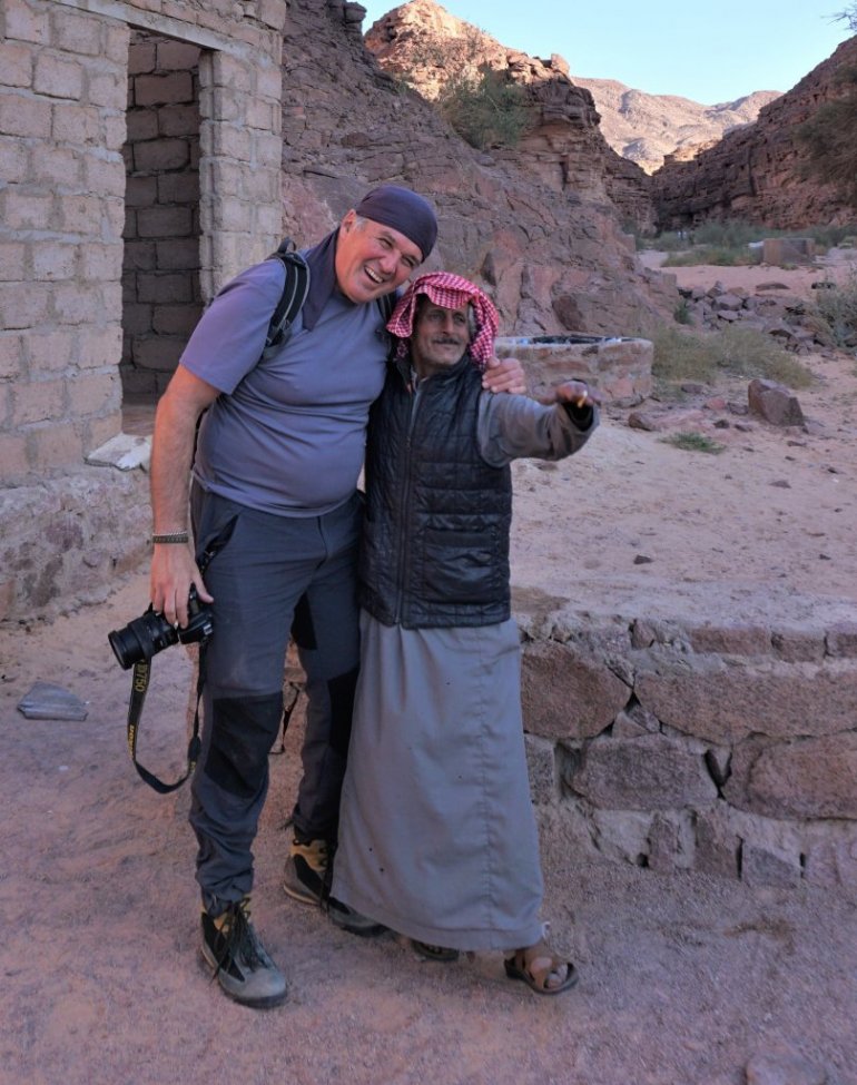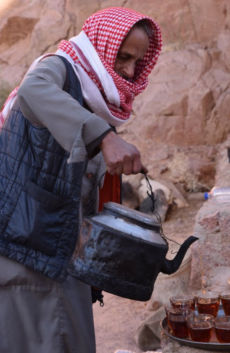 Једини истински становници и владари овог суровог света који живе у симбиози са њим су бедуини. Водич Окаша ме је провео поред играча "школица" на дну Обојеног кањона који су бујице у далекој прошлости, док су овде још падале кише, уклесале у камен, и довео на чај у овдашњи бедуински "кафић". Он западњаку изгледа као низак камени темељ чија је унутрашњост застрта ћилимима, а у средини је огњиште са огромним чађавим чајником. Две крупне забрађене бедуинке продају шарене ђинђуве, а њихов муж, стари мршави бедуин, дежура крај чајника и приноси гостима чашице миришљавог напитка са пустињским биљем.