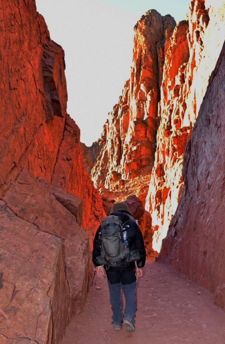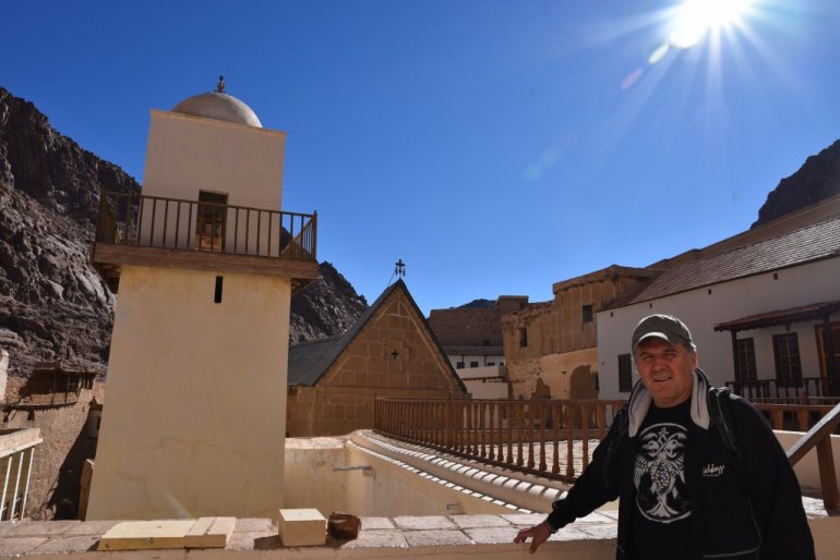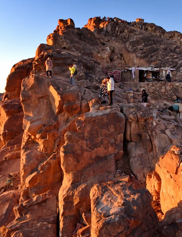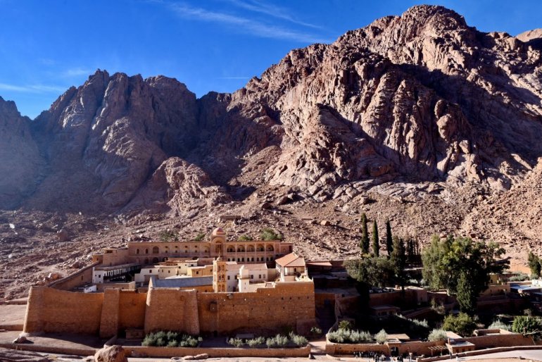 МАНАСТИРСКА базилика коју је издградио цар Јустинијан у 6. веку, посвећена Преображењу Господњем, чија три брода раздвајају колонаде високих стубова са богато рељефно украшњеним капителима од тамног вулканског камена изгледа и данас као у Јустинијаново време. Нажалост, његов монументални црквени комплекс на врху Синајске горе срушен је у неком великом земљотресу пре 12. века и тек 1935. је од његовог камена направљен данашњи храм. Јустинијаново Стрмо степениште искушења са хиљадама степеника већ неколико година није у употреби због безбедности, па се иде обилазном стазом до Мојсијевог врха.