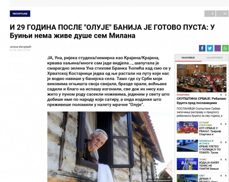 Реч је о једној од седам репортажа које су Матијевићева и наш фоторепортер Игор Маринковић, урадили путујући Банијом, предивном, а готово пустом, и 29 година неопорављеном од последица "Олује", злочиначке акције хрватске војске и полиције, августа 1995. У напуштеним селима живе углавном старији, а у целом селу Буиња већ 21 годину сам, самцит, живи Милан Буињац...