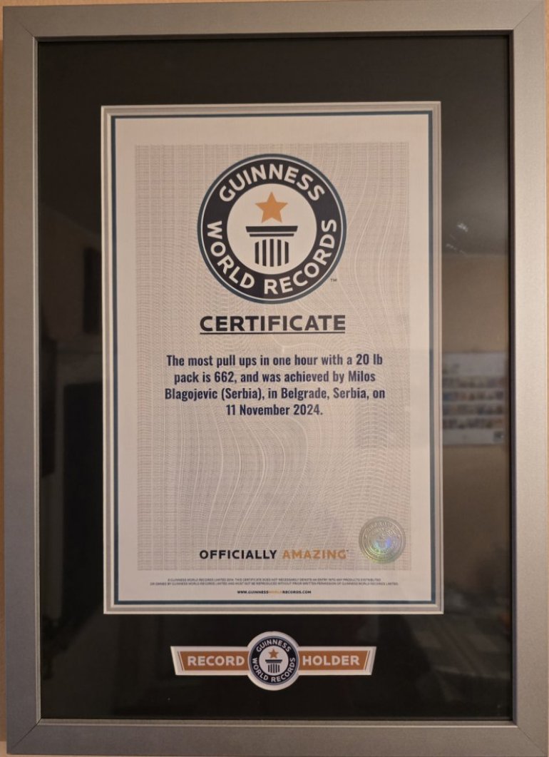 МИЛОШ је из другог покушаја постао Гинисов рекордер. Заједно са тренером Небојшом Шкорићем 2023. се припремао да премаши Аустралијанца Џексона Италијана који је урадио 8.008 згибова за 24 сата. Није у томе успео. То, на срећу, овог младића није деморалисало, већ је наставио још јаче да се бори.