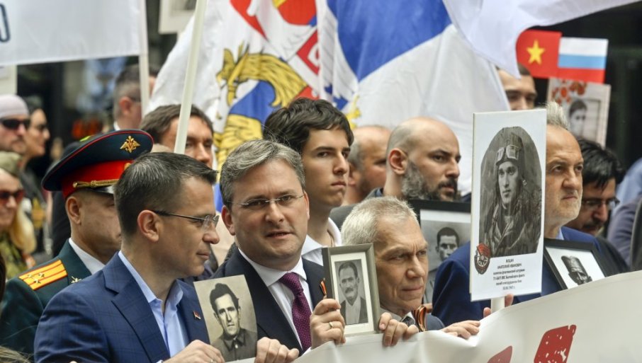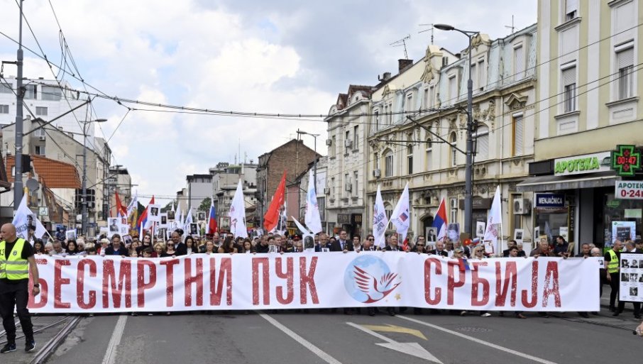 ПОВОДОМ обележавања Дана победе и 80. годишњице победе над нацизмом у Другом светском рату, више од 10.000 људи корачало је јуче у "Бесмртномпуку" улицама Београда. Свечана шетња је кренула од Спомен-гробљаослободилаца Београда и упутила се ка Тргу републике. "Бесмртни пук" супредводили потпредседник Владе и министар привреде Адријана Месаровић, министар културе Никола Селаковић, министар државне управе и локалнесамоуправе Снежана Пауновић, министар заштите животне средине СараПавков, министар спорта Зоран Гајић и амбасадор Руске Федерације у Републици Србији Александар Боцан-Харченко.