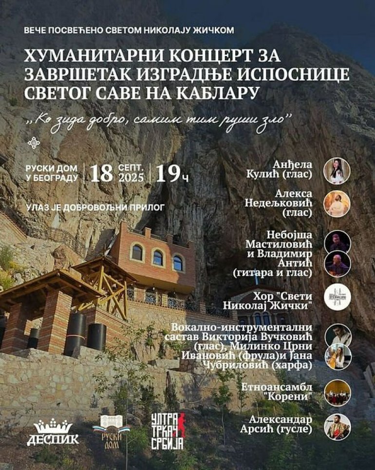 У РУСКОМ дому у Београду, вечерас у 19.00 друштво "Деспик - Чувари корена" организује добротворни концерт српске духовне музике посвећене Светом Николају Жичком. Сврха концерта је прикупљање средстава за завршетак изградње Ћелије Светог Саве на Каблару.