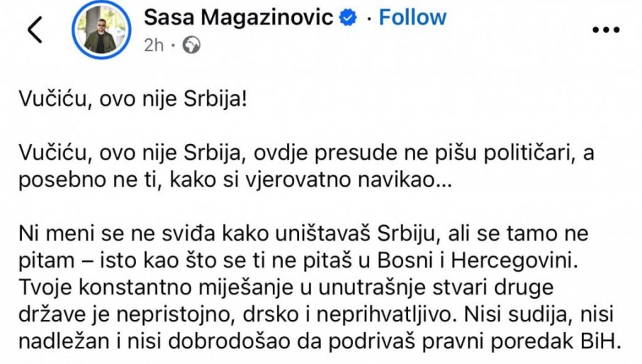 - Вучићу, ово није Србија. Вучићу ово није Србија, овде пресуде не пишу политичари, а посебно не ти, како си вероватно навикао. Ни мени се не свиђа како уништаваш Србију, али се тамо не питам , исто као што се ти не питаш у БиХ. Твоје константно мешање у унутрашње ствари друге државе је непристојно, дрско и неприхватљиво. Ниси судија, ниси надлежан и ниси добродошао да подриваш правни поредак БиХ - рекао је Магазиновић.