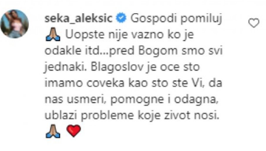 - Господи помилуј. Уопште није важно ко је одакле итд… Пред Богом смо сви једнаки. Благослов је оче сто имамо човека као што сте Ви, да нас усмери, помогне и одагна, ублажи проблеме које живот носи - написала је Сека Алексић.