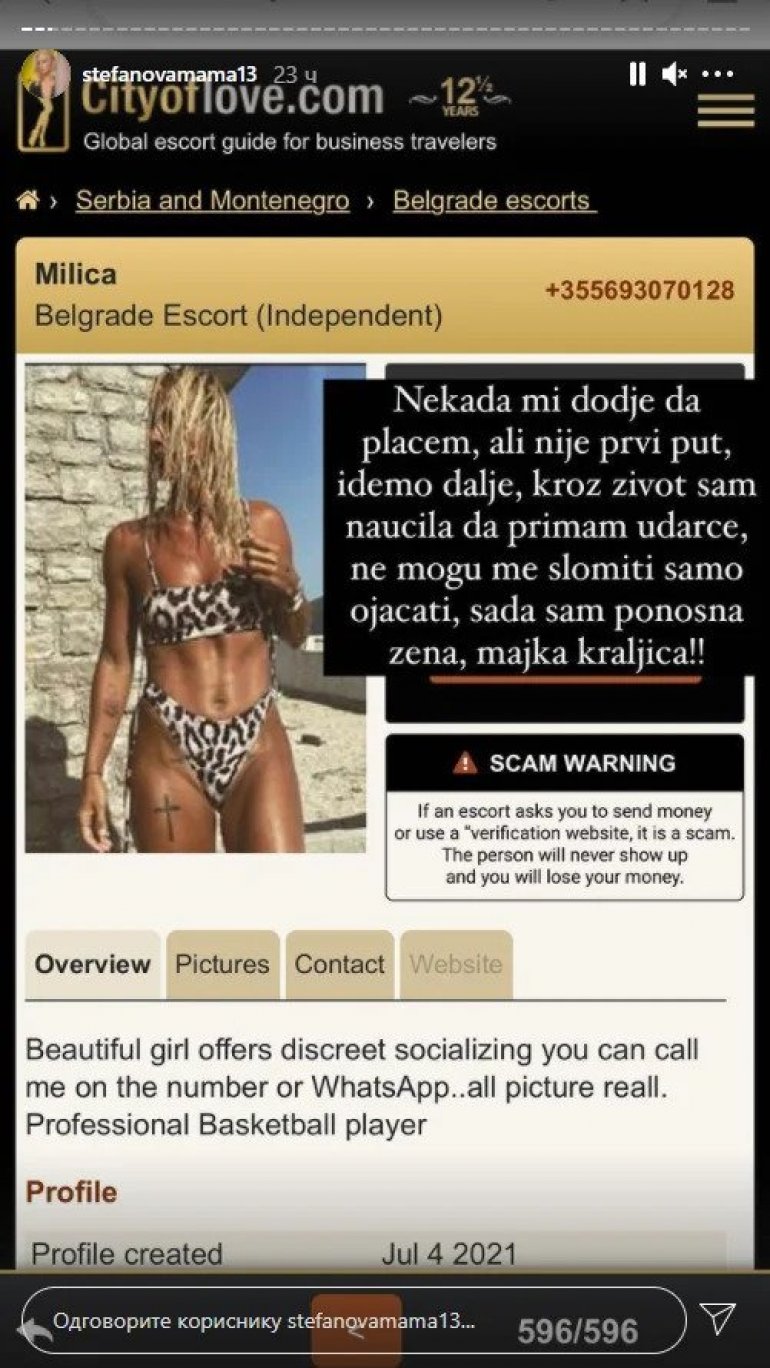 - Ко год да ово ради, желим да му кажем, нека му је велики Бог у помоћи – започела је Дабовићева. Некада ми дође да плачем, али није први пут, идемо даље. Кроз живот сам научила да примам ударце, не могу ме сломити, само ојачати, сада сам поносна жена, мајка, краљица – написала је она. Покушала сам да контактирам људе, па ћемо да видимо да се ово што пре угаси. Многима хвала на подршци и лепим речима – написала је Милица Дабовић и објавила лажни оглас на спорном сајту.