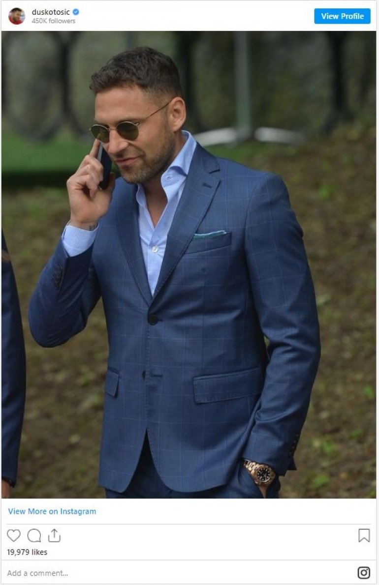 Тошић је фотографисан у елегантном оделу док телефонира.