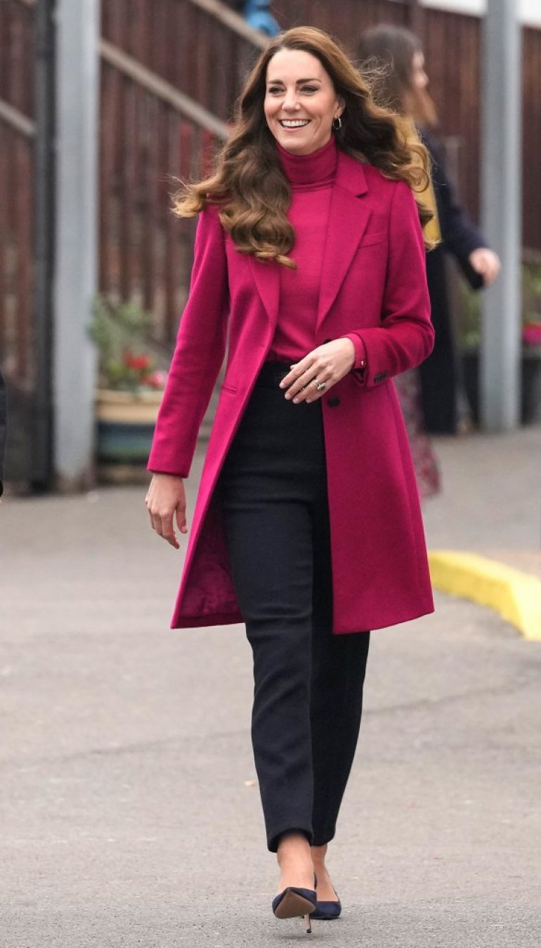 Као и увек, 39-годишња војвоткиња од Кембриџа прилагодила је своју одевну комбинацију догађају ком је присуствовала. Овога пута, посету средњој школи у северном делу Лондона уприличила је розе комбинацијом, која је унела боје упркос лошем времену.