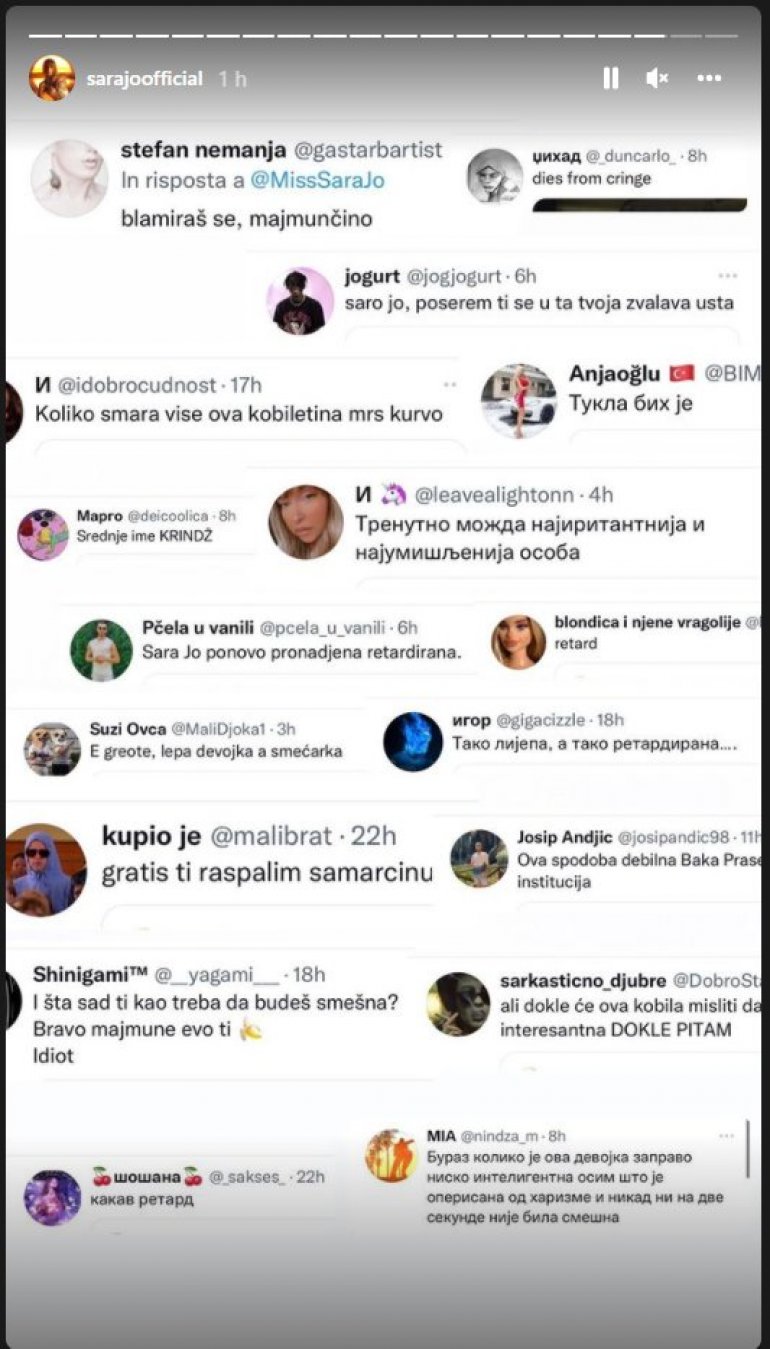 "Бламираш се, мајмунчино", "колико смара више ова кобилетина, мрш", "тукла бих је", "докле ће ова кобила мислити да је интересантна?", само су неке од многобројних шокантних порука које је Јовановићева добила, које су за сваку осуду, па је певачица многе и поделила на Инстаграму.