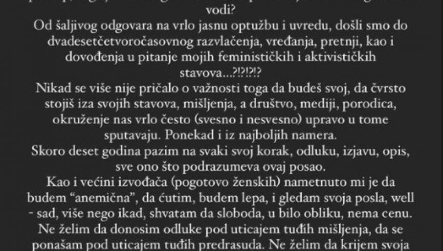 - Колико год да ми је јасно да се не може удовољити свима, и даље успе да ме изненади то у коликој мери је присутно лицемерје на друштвеним мрежама. Тема је преопширна, и због тога сам углавном избегавала дискусије о томе, али 'ајде овог пута да се надовежем на јучерашњу објаву... Дакле, ако се не огласиш и не изразиш своје мишљење, незанимљиви си и досадни бескичмењак. А ако се изјасниш и даш свој коментар о нечему, онда си надмена и умишљена будалетина - написала је, између осталог, Сара.