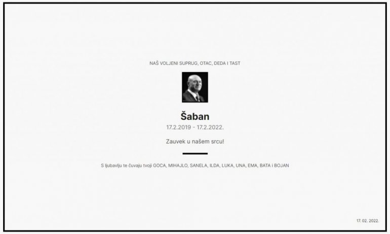 - Заувек у нашем срцу. С љубављу те чувају твоји Гоца, Михајло, Санела, Илда, Лука, Уна, Ема, Бата и Бојан - пише у читуљи.