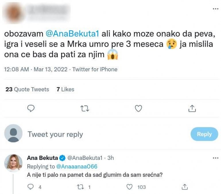 ЈЕДНА корисница друштвене мреже Твитер осудила је певачицу Ану Бекуту, те истакла као је изненађена што се певачица весели само три месеца након смрти Милутина Мркоњића.