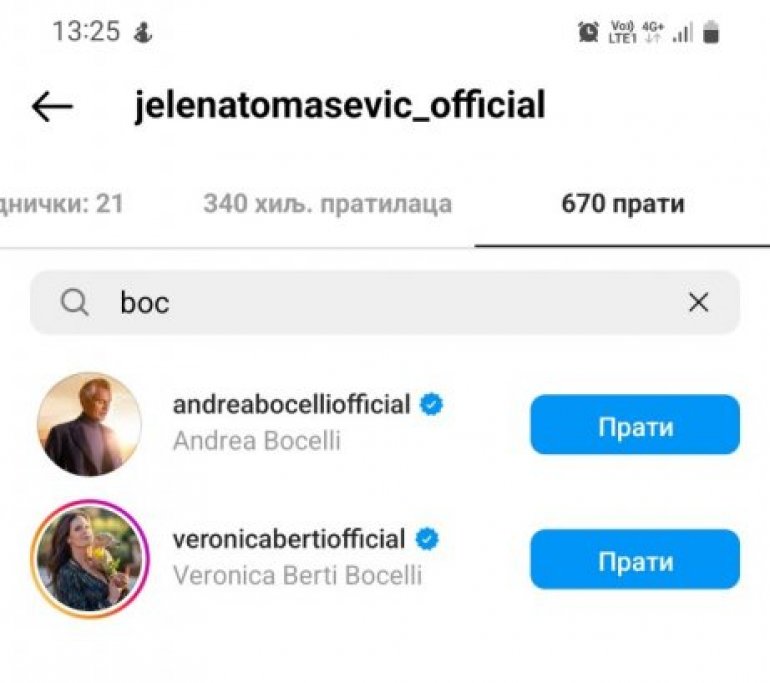 НАКОН што је, пре недељу дана, један од најбољих светских тенора наступио у Београду, а с њим се на бини се појавила Јелена Томашевић, Андреа Бочели запратио је нашу певачицу и на Инстаграму.