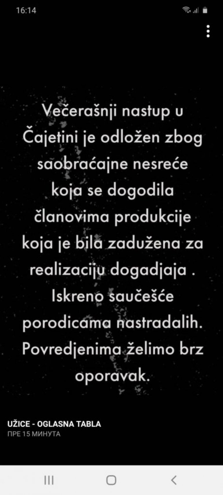- Вечерашњи наступ у Чајетини је одложен због саобраћане несреће која се догодила члановима продукције која је била задужена за реализацију догађаја. Искрено саучешће породицама настрадалих - пише у објави на Фејсбук страници "Ужице - огласна табла" што је поделио и Сале Тропико на својој Инстаграм страници.