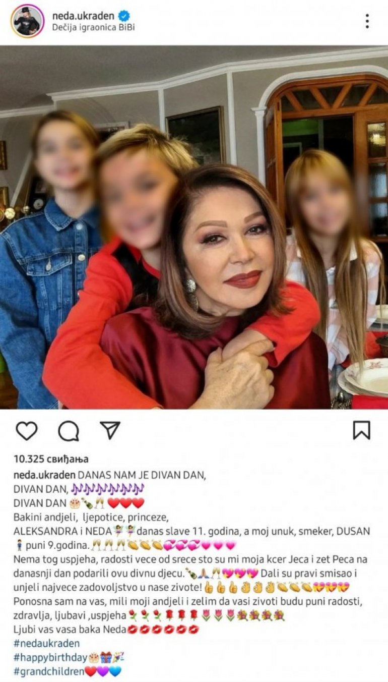 - Бакини анђели, лепотице и принцезе Александра и Неда данас славе једанаести рођендан, а мој унук шмекер Душан девет година. Нема тог успеха, радости већег од среће што су ми моја кћерка Јеца и зет Пеца на данашњи дан подарили ову дивну децу. Поносна сам на вас, мили моји анђели и желим да ваши животи буду пуни радости, здравља, љубави, успеха – гласила је честитка коју је Украден написала испод фотке са унуцима која је покупила све симпатије њених пратилаца. Фото: Принтскрин/Инстаграм/неда.украден