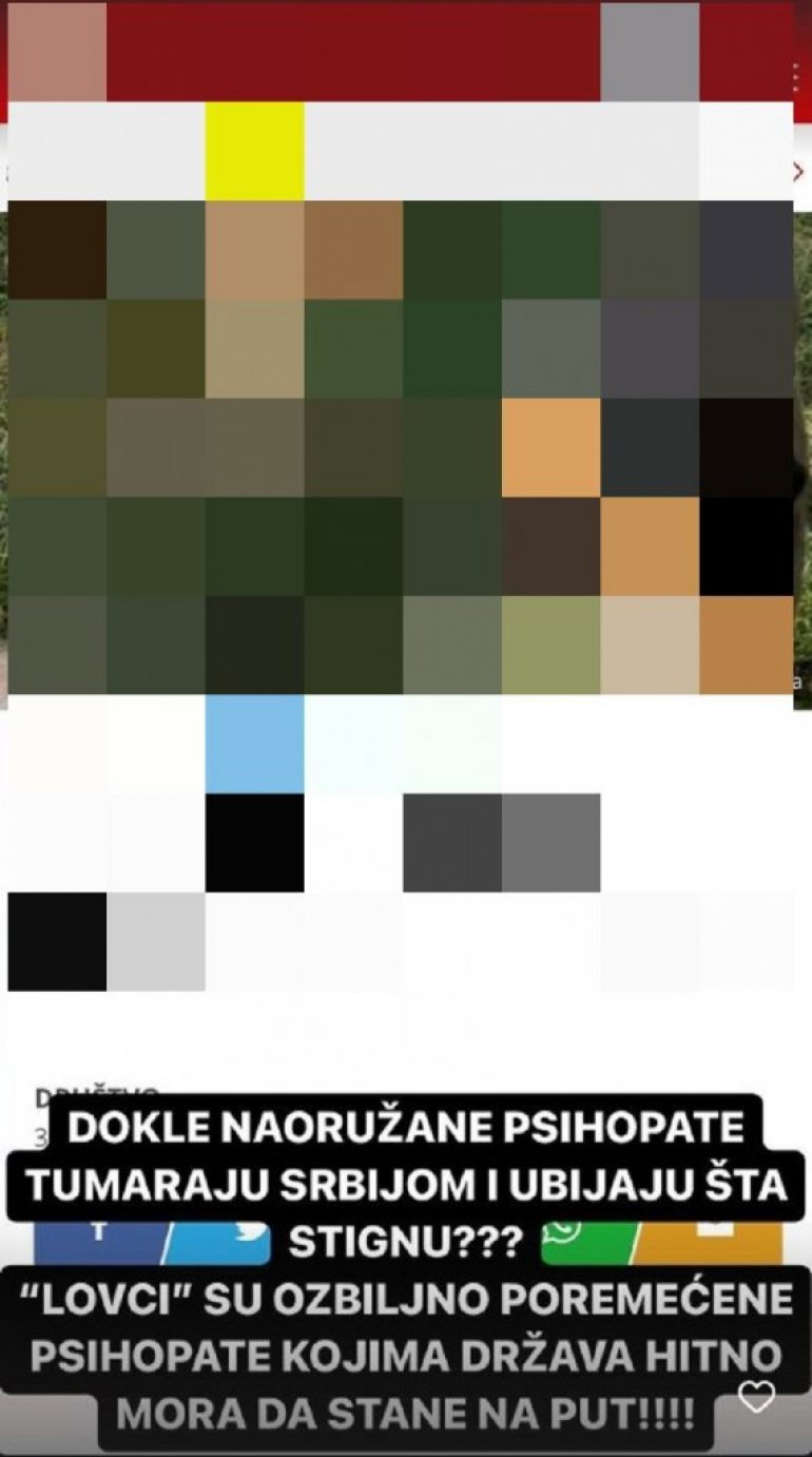 - Докле наоружане психопате да тумарају Србијом и убијају шта стигну?! "Ловци" су озбиљно поремећене психопате којима држава хитно мора да стане на пут!!!! - написала је видно изреволтирана Карлеуша на поменутој мрежи.