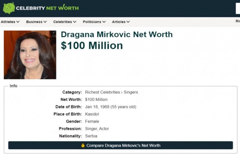 Сајт "Алпја Лифе" који је Драгану уврстио у пребогате јавне личности тренутно ради најновији пресек њеног богатства. Да ли ће резултат премаштити ових 100 милиона долара?
