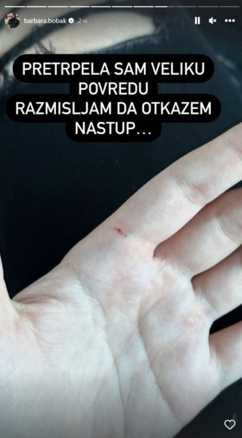 Она је сликала своју повређену руку, где се видела мала раница и на шаљив начин написала како је претрпела озбиљну повреду, због чега размишља чак и да откаже наступ.