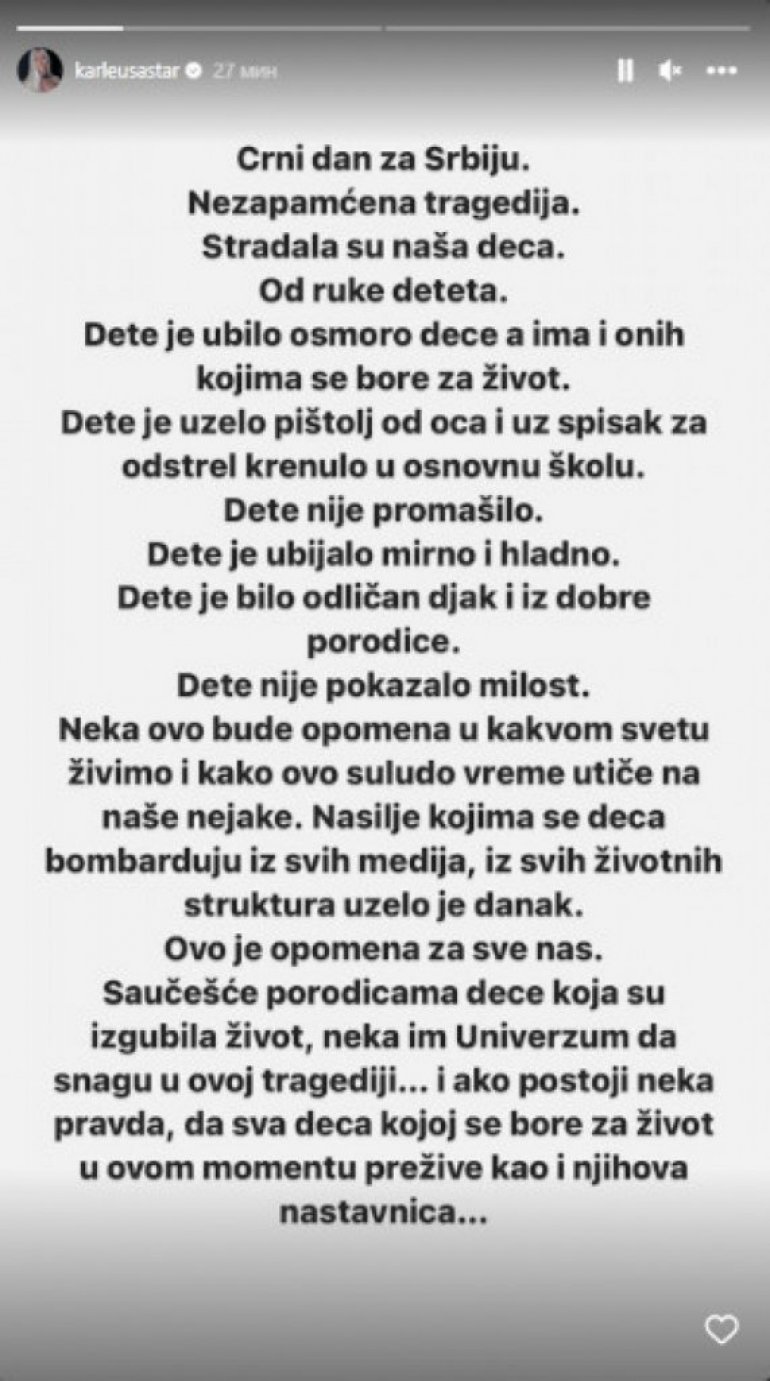 - Црни дана за Србију. Незапамћена трагедија. Страдала су наша деца. Од руке детета. Дете је убило осморо деце, а има и оних којима се боре за живот. Дете је узело пиштољ од оца и уз списак за одстрел кренуло у основну школу. Дете није промашило. Дете је убијало мирно и хладно. Дете је било одличан ђак и из добре породице - гласи објава.