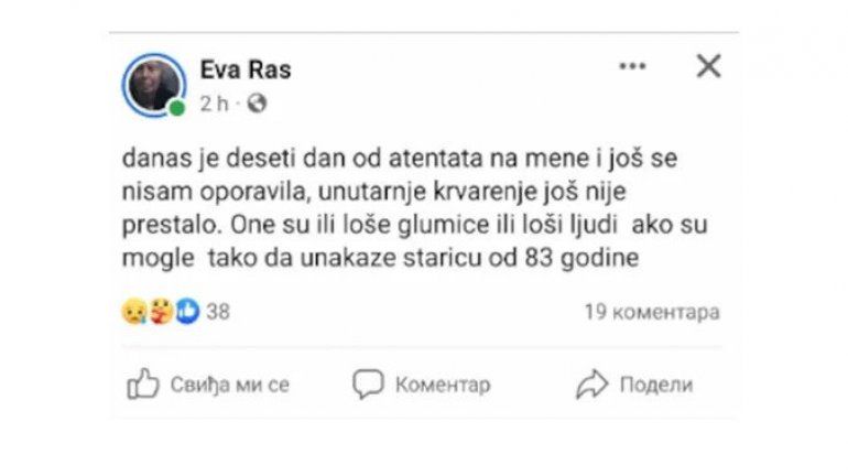 ЕВА Рас објавила је на Фејсбук профилу да је на снимању доживела незгоду, наводећи да су "или лоше глумице или лоши људи" кад су "могле тако да унаказе старицу од 83 године".