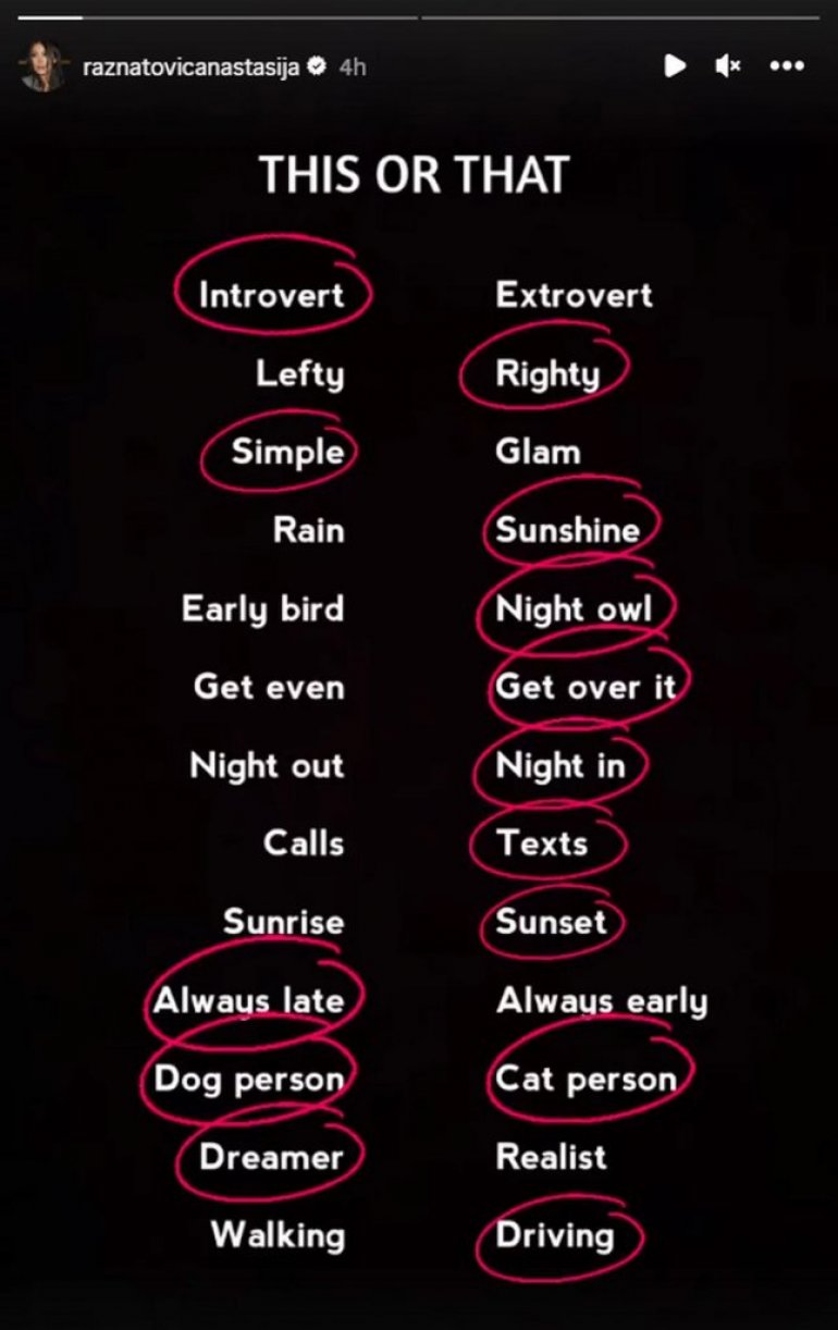 Анастасија је навела и да се никад не свети, већ одмах пребољева оно што јој је неко урадио, као и да увек бира вожњу уместо шетње.