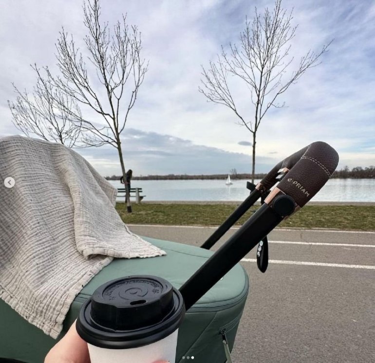 Чини се да дечак већ иде и у шетње са мамом, па је објавила и фотографију из парка, док је испијала кафу а поред ње су била колица.