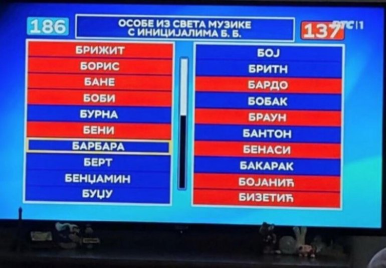 У популарном квизу "Слагалица" такмичари су имали задатак да наведу све особе из света музике са иницијалима Б.Б. На списку поред Брижит су се нашли и Боби Браун као и Бане Бојанић и Барбара Бобак.